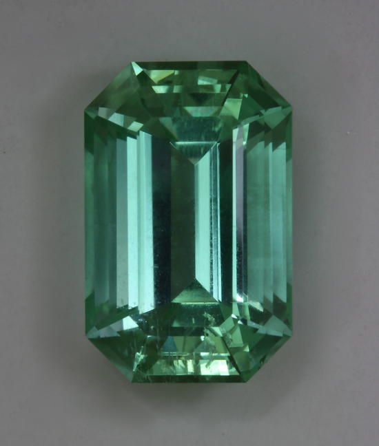 This outstanding sea foam emerald cut has some light scatter in on end. It has everything going for to be a GEM except for the scatter. It weighs 7.22 carats.