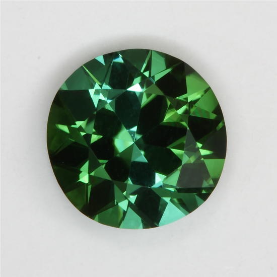 Another example of the subtle glory of a dichroic green standard round brilliant. Its darker nature limits flash, but it is eye clean and an intimate type of gemstone. It weighs 1.60 carats and is a droplet.