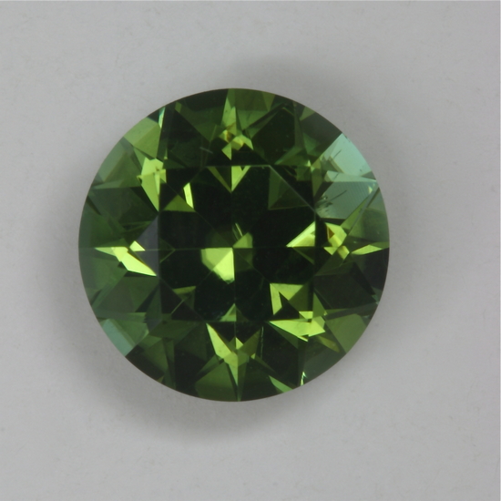 This is not a happy spring kind of green standard round brilliant. This medium toned green does try to get up in the yellowish light, but a touch of blue keeps it more sophisticated. It appears to be eye clean and with fine crystal. It weighs 2.25 carats.