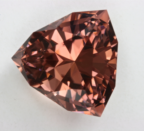 This larger peach shield cut, with a different overtone, has a couple of spots in one corner, but the view from the table is nothing, but bright and flashing. Still something keeps this peach cool and not really ripe to be eye candy. It is a pity, but then its different look does add dimension to the collection. This shield cut weighs 6.31 carats.