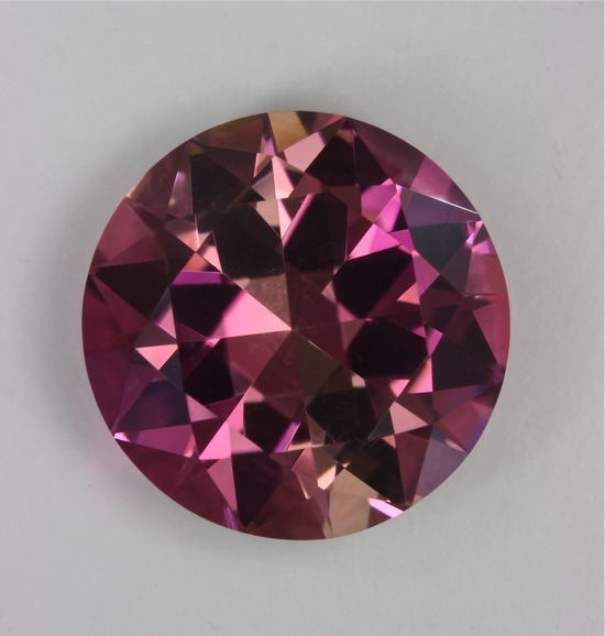 This emerald cut was oriented parallel to the c axis. This presents alternating slices of pie, of the richer c pink and paler a/b pink color, The round is eye clean and bright. It weighs 7.51 carats.