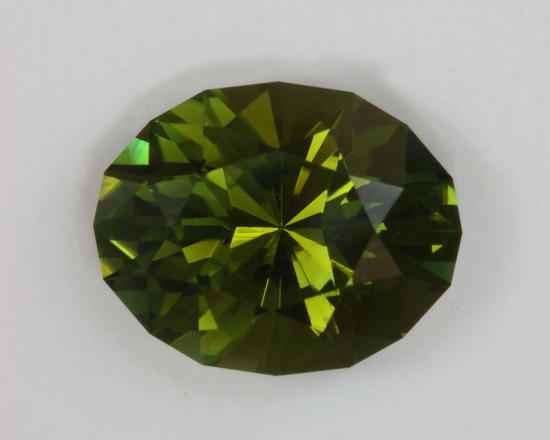 Tourmaline comes in every shade of green from yellows that just a touch of green to blues the hate to show their green wash. This oval is a bid different green with a level of yellow that reminds me of the seaweed I use to have in my aquarium. It has good crystal and is moderately flashy, which is pretty good for a medium dark toned green. It does appreciate a good light source to show itself off the best. It weighs 2.81 carats.