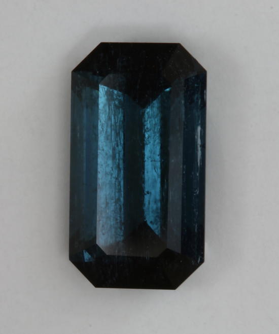 This blue emerald cut is dulled by flaws that parallel the c axis and look like the tourmaline did not grow together properly. It has dark ends, but a decent blue. It weighs 1.73 carats.