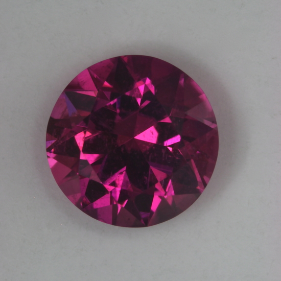 I am sure that it takes a variety of factors (known and unknown) to make a great hot pink round.  I can do my  best, but some pinks are hot and some are not.  This is one of those hot ones.  This standard round brilliant has a little scatter toward the girdle, that is irrelevant to its beauty, but I don’t think that cleanliness is a significant factor in hotness.  I also know that manganese +3 can be solely responsible for red in some tourmaline and I hope to use my spectrometer and other testing to see what is hidden in the tourmaline that might go beyond just being red.  I have read  about and seen indications of absorption of visible light, right at the boundary of the infrared.  It could either be copper or manganese +3, but the real question I have is why Mn+3 sometimes produces this increased absorption of light and at other times it does not.  I don’t have an answer, but I have seen a relationship between the perceived brightness of a hot pink tourmaline and the absorption at the far red end of the spectrum by probably Mn+3, in the collection.  I am working to get a better view of the complete spectrum for those hot tourmaline that show the increased absorption.  The posted stone weighs 2.10 carats.