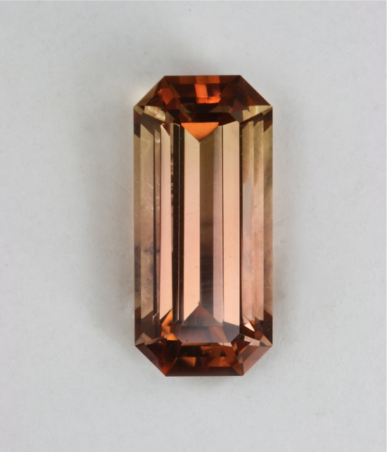 This smaller emerald cut has an exceptionally nice medium light toned golden brown color. A color that is not common in tourmaline that has lighter tones. It is dichroic and the c axis, which is in the ends of the long ratio stone, is the same color as the much paler a/b axis color. So the dichroic colors work together with an eye clean body, to make a beautiful, delicate emerald cut that weighs 1.41 carats.