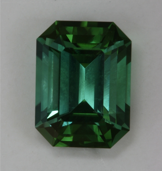 This moderately toned emerald cut is dichroic. Its open ends are green and the sides are a much paler bluer green. It appears to be eye clean and with fine crystal. It weighs 1.88 carats.