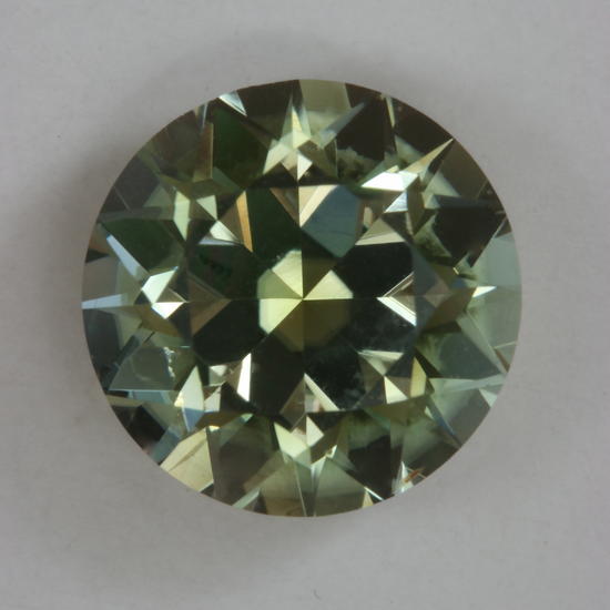 You probably have seen and will see more of this color, that rides the edge of the yellow green line, because they are not in great demand and I scoop them up. They always polish easily and make very bright gemstones in the standard round brilliant that you see here. This example is eye clean and has a light pastel tone level. It weighs 3.59 carats.