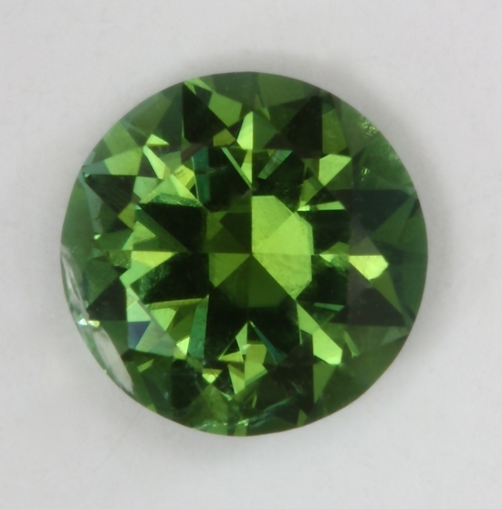 I am guilty of pushing the rough to get the best yield I can while protecting the color potential of the piece of rough. What has to give, at times, is the retention of flaws that could have been removed. This standard round brilliant is an example of that philosophy. Except for a thin white opaque flaw that sits along the side of the girdle, this round is eye clean, bright and flashy. I could have easily removed this flaw from the .86 carat gemstone, while probably reducing it to half its size, but it would have been a waste to me. If this stone is ever set, a reasonable choice of a setting could conceal the flaw and reveal the true beauty of the stone. I would also loose a lot of medium dark, forest green that I love in a droplet of color.