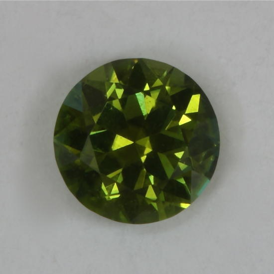 This standard round brilliant has a good tone level for a smaller droplet of color. The rather sedate green is just that green. It seems with tourmaline you are always reaching for adjectives to describe the multitudes of greens. Well this time I am leaving the color as just green. The eye clean droplet of color (I confess it is a little on the yellow side) weighs .46 carats.