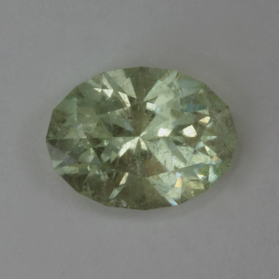 The posted gemstone is the biggest yellow that I was able to cut. It is without green under any reasonable conditions and has almost an IceT tone level (light tone level). It rather reminds me of lemon juice and while it has decent crystal the whole stone is filled with bright dots of inclusion and a slight feather down the middle of the gemstone. Still I am pleased to have this sample, that between its color, with its good saturation and tone level is unique in the collection. And that is after many years of trying to get any yellows I could. It weighs .90 carats.