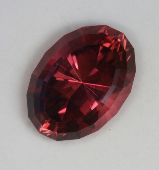 This oval has two rows of steps on its crown. It is a pink peach slider with darker overtones. It is eye clean and with fine crystal and weighs 1.56 carats.