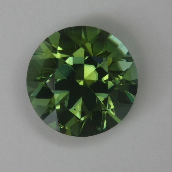 This standard round brilliant is cut with it table perpendicular to the c axis. This gets the highest tone value out of a pale crystal. It is used much more often with pink/red because of the strong dichroic nature of many greens. The c axis color is a very nice medium toned green in this gemstones. It also appears to be eye clean and with fine crystal. It weighs 2.21 carats and would be easy to set in commercial mountings because of its size a cut.