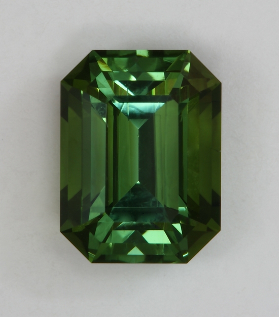 A nice green, barely dichroic, emerald cut with a good helping of bronze. It appears to be eye clean and with fine crystal. It weighs 1.91 carats.