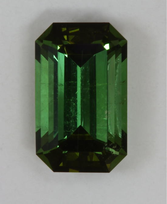 The posted emerald cut has a light residual mark from a radial fracture in the middle of the gemstone. It is not visible face up, but would pose a threat to the stone during setting. The rest of the features of this stone are classic closed ended, green, emerald cut tourmaline. It weighs 2.21 carats.