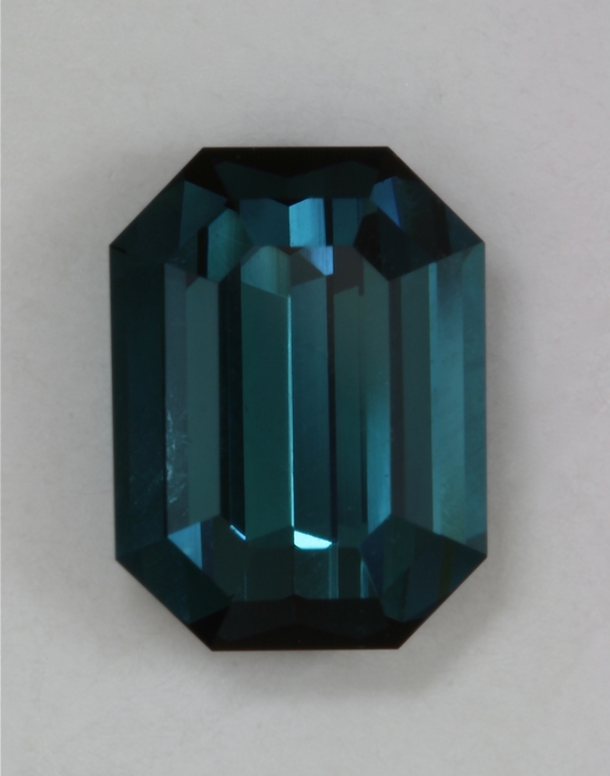 This blue with a touch of green emerald cut's flash driven color, seems less saturated than the best Namibian. It has steep ends to lessen the impact of the closed ends. It appears to be eye clean and weighs 1.97 carats.