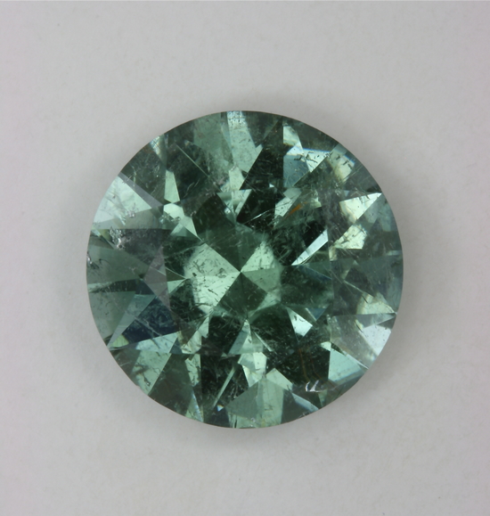 Cuprian, Included medium pastel blue green round. #138 This standard round brilliant has enough light inclusions to make its crystal poorer quality. It is still a flashy, blue green gemstone because of its completely open moderate tone level. It weighs 4.95 carats.