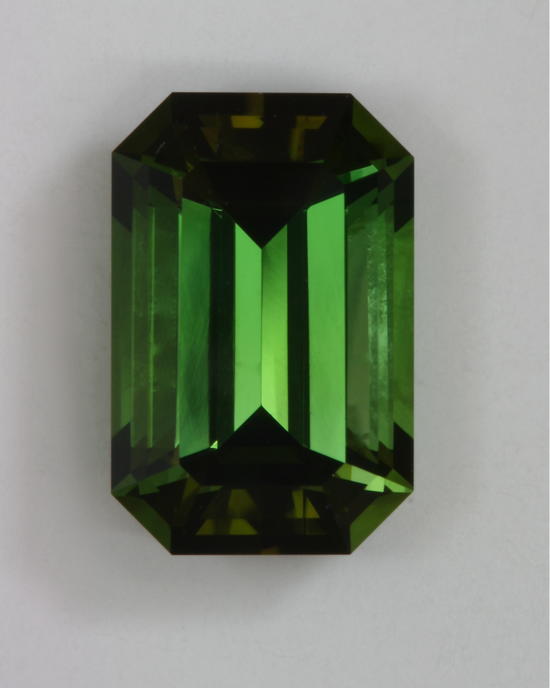 Well the posted stone came threw the cutting process with its purity intact. Its naturally beautiful green color is express in an emerald cut, by necessity, but this gemstone has not given up the fight for a spot in someone heart. I did give out one more liability to the emerald cut, with its pluses and minuses. I cut the ends of the emerald cut with normal angles for open ended tourmaline. This caused the darkness to creep a little closed to the center, lets the corner be smaller and less invasive. It also improves what flash you get in the ends, in my opinion.