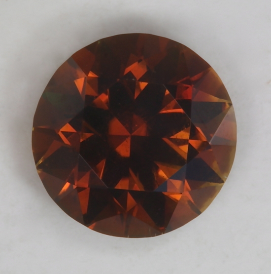 Medium dark toned orange, a little burnt, but nicely done, droplet of color.  #55 This standard round brilliant has a very nice medium dark tone level and a good saturated orange color. There is certainly brown in this eye clean droplet of color, but it is not excessive. It weighs .86 carats.