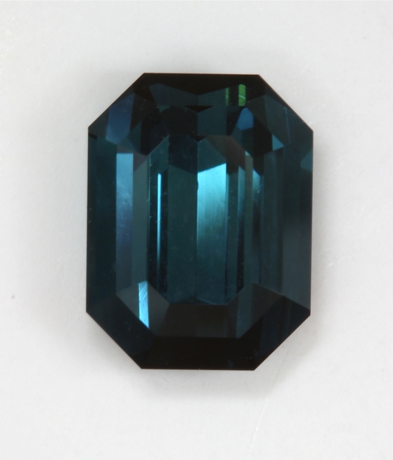 This darkly toned blue emerald cut has steep ends as a result of having closed ends. The blue is toned down with a little gray and it takes a bit of close inspection to appreciate this gemstone. Under closed inspection it appears to be eye clean and of fine crystal. It does enjoy the sun. It weighs 1.99 carats.