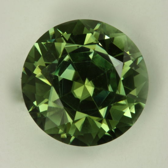 Between cutting this gem perpendicular to the c axis and using horizontal spit mains in the pavilion, this round is exceptional. Its medium toned green is very bright and appears to be eye clean. It weighs 7.11 carats.