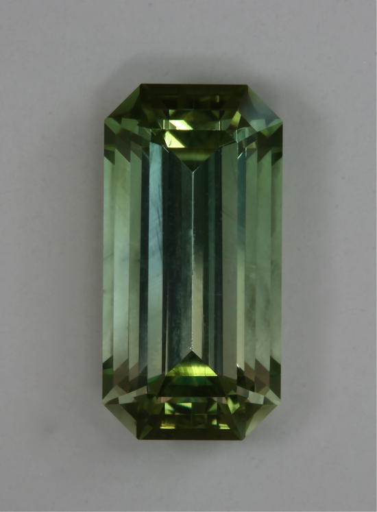This is an unusual emerald cut that grades from colorless to a moderate green. It is eye clean and very bright and flashy. It weighs 2.91 carats and is unique in the collection.
