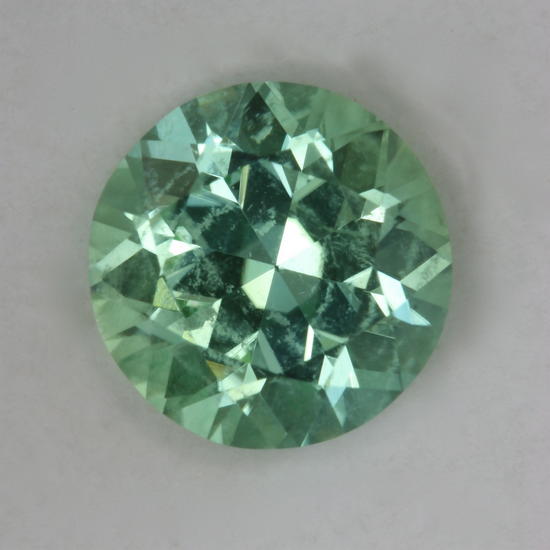 The droplets wanted this really high quality sea foam from Afghanistan, but she is just too big. She has a medium toned flawless beauty that can stand alone. This standard round brilliant is cut with its table perpendicular to the c axis. The cut produces a gemstone with an even color, formed by mixing the two colors of sea foam. (yellower green and bluer green). She weighs 1.91 carats.