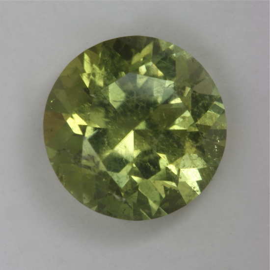 This standard round brilliant has many light wispy feathers. It has an average brightnes and a nice mostly yellow color with a wash of green. It contains copper and weighs 3.35 carats.
