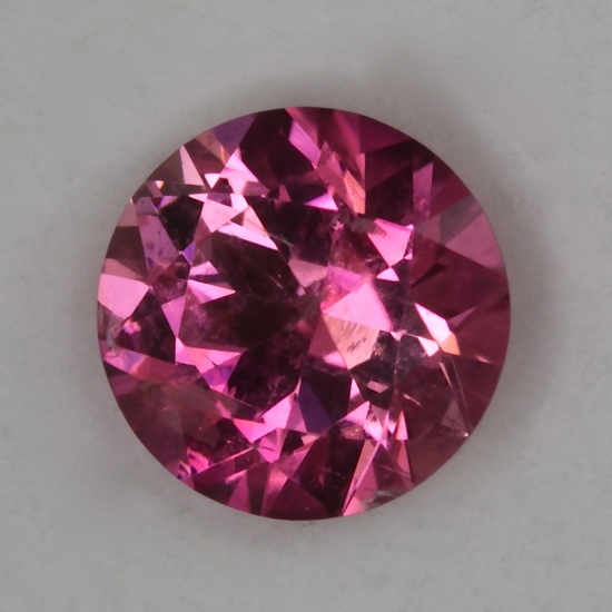 When you have enough tourmaline pinks (or other colors) to compare you can begin to see some subtle color differences in tourmaline. At least that is one of the goals I hoped to achieve with my collection. This hotter pink has just an edge of red compared with some of its brighter cousins. With its medium tone level it is certainly not a red nor does it seem to have any purple tones. The posted standard round brilliant has a white non-reflective inclusion toward the girdle, but still is a nice bright flashy gemstone. It weighs .65 and is a droplet of color.