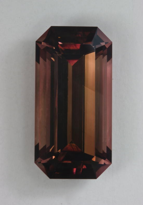 This is a very nice medium toned brown that will show you some maroon flashes. It is eye clean and has fine crystal. It is dichroic, but the ends of the emerald cut are not to dark. It weighs 4.54 carats.