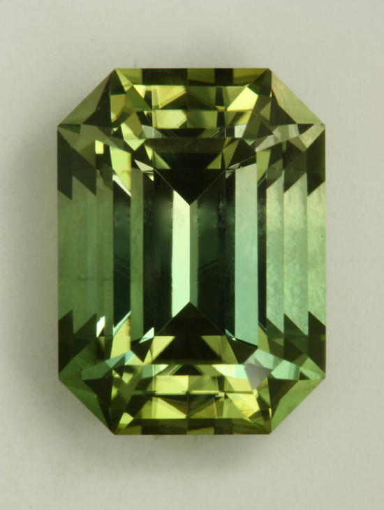 This is a gem. It has everything going for it including a really fine glow. It is only mildly dichroic and its color is dominated by the stronger c axis color of yellowish green. It has a medium tone value in a flawless heart. It weighs12.47 carats.