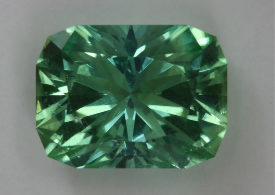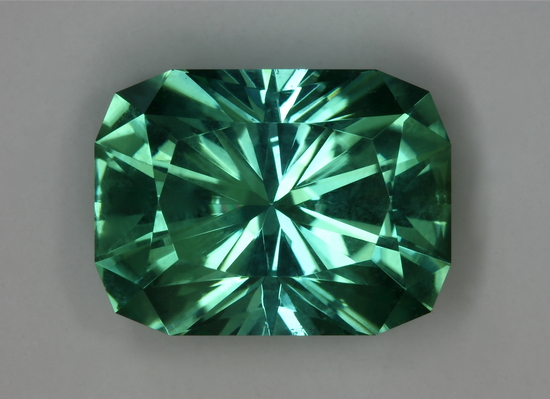 This is the larger of two identical Barion cuts I made from one crystal mined in Afghanistan. It is a wonderful medium toned, sea foam stone with no problems. It weighs a prized 13.39 carats.