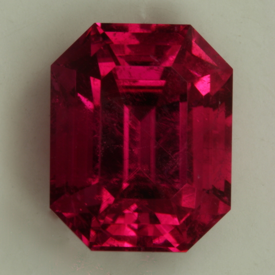 The next distinctly great tourmaline I obtained from Afghanistan is called strawberry. It is always found in large crystals that need to be sawed rather than the more common cobbling that is done with tourmaline. The sawing is needed because strawberry is always included, but it has to be the ultimate in rich saturated pink in tourmaline. The following emerald cut is the only notable example that I have.