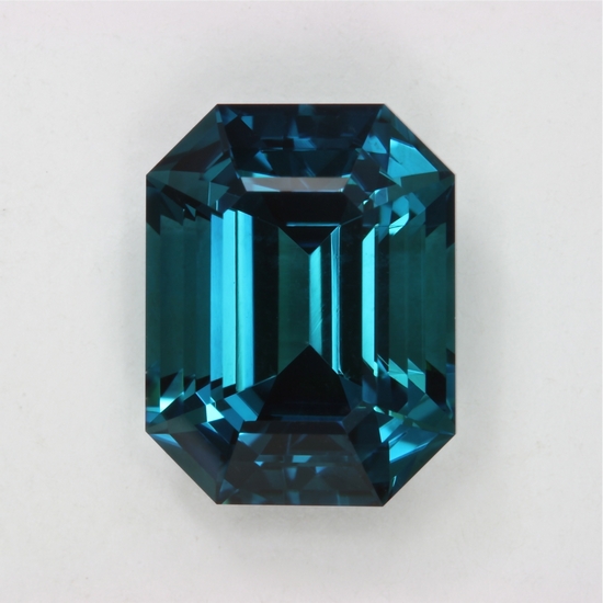 This is a GEM that has an excellent medium tone value along with its great color that is richer in the ends of the emerald cut. The bright blue is stable under my yellowish light and daylight. It weighs 5.27 carats.