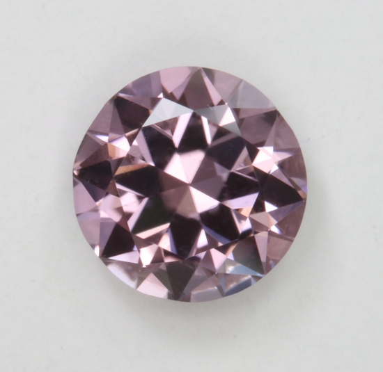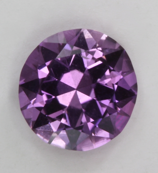 A standard round brilliant, non copper, less tone level than the following cuprian purple, but very similar hue (color).  It weighs 1.01 carats.