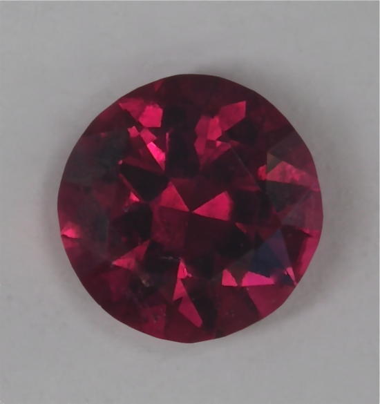 Well this singularly unique .35 carat standard round brilliant breaks all the rules. Its tone level is so high that a bigger gemstone would be a disadvantage.  The flash driven color is of a fine ruby or pyrope garnet.  Now you might ask how do I know that this is a tourmaline.  First I cut and polished it and I know it is not a ruby from that.  It is possible that cutting and polishing this gemstone would not eliminate a pyrope garnet.  (I found a bigger red tourmaline that turned out to be a Rhodolite in my collection).  But I used my spectrometer to check this red gem out.  It passed the test with flying colors, while it easily caught the Rhodolite garnet faker.  Now there is one possible gemstone that I can not eliminate.  (I don’t mean spinel that I just thought of)  It would actually be great if it was… red Dravite.  Dravite is used as a varietal name for brownish tourmaline and it is also a distinct mineral in the tourmaline group.  The species is best known as chrome tourmaline, though East Africa produces other very interesting gem quality varieties of Dravites.  I even have first hand experience with a couple of dark red Dravites that I recut for a jeweler years ago.  It was as close to the red of garnet or ruby in tone value and saturation, as I had ever seen in a tourmaline.  I wish that I had bought one, but I was still hoping to get rough, which never worked out.