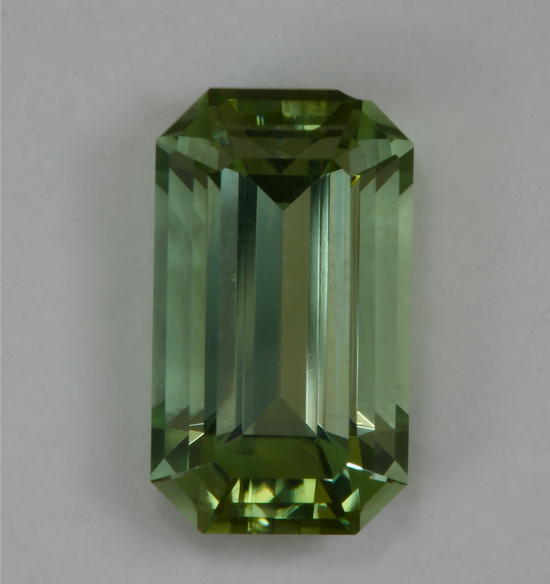 The only problem with pretending that this is not a tourmaline is the color.  I don’t know too many other gemstones that have this stone’s bright yellow green hue. (Maybe beryl)  Still all the people who think that tourmaline is only darker greens would be amazed by this emerald cut’s light tone and great transparency.  There is nothing close to dark ends, because this rarer green does not appear to be dichroic.  Also the tourmaline has taken such an outstanding polish that people might begin to think of garnet with its higher index of refraction and  brighter nature.  Anyway I would confess that this lovely, spicy, emerald cut, which weighs 2.10 carats. is a tourmaline.