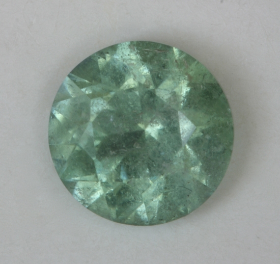 The rough for this standard round brilliant was purchased from Brazil. It has a minty green color and is moderately included. It weighs .85 carats and is a droplet of color member.