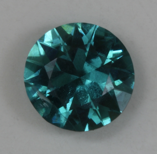 This standard round brilliant is compromised by a significant white inclusion about half way between the girdle and the table.  It doesn’t flash, but it is quite visible.  Still the stone has such a beautiful blue and it still sparkles.  A wounded bird that was still worth finishing.  It weighs .56 carats and has won a seat on the governing body of the droplets of color.
