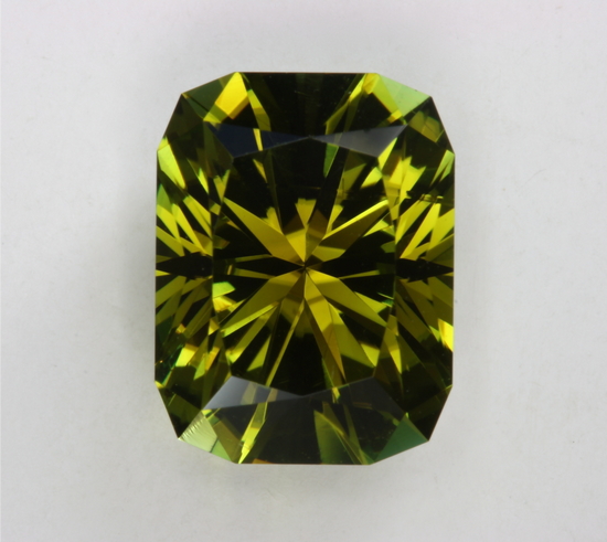 This is a beautiful gemstone despite being a color that is not particularly appreciated in tourmaline.   This olive green Barion cut has such great flash and crystal that even its brownish green color dances.  Its medium tone and limited amount of brown also helps.  It appears to be eye clean and weighs 4.41 carats.  It would be nice if I had more rough, with the higher depth to width ratio that I need to cut Barion cushions.