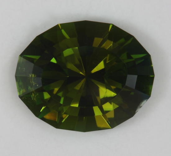 I have posted before about an interesting phenomenon of decreased transparency down the c axis. This green gemstone is an excellent example of that phenomenon. Under the table, which is perpendicular to the c axis, is a bit darker olive green that is very reluctant to flash. While around the table is a ring of forest green flash that is more of what I would expect from this oval. I have to admit that I had read about this phenomenon, but never seen it as clearly before, as I now see it in this gemstone.