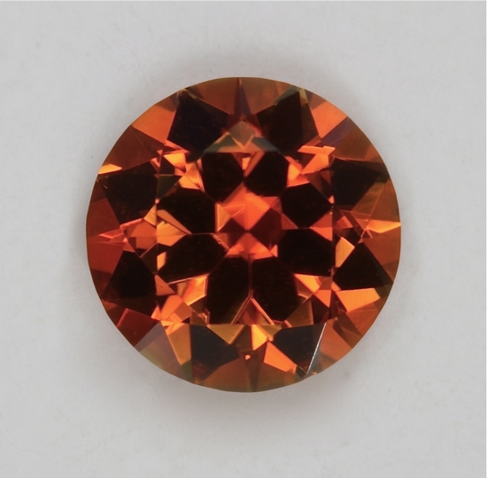There are three candidates for the title of the best all around orange in a smaller stone, from the droplets of color’s world of standard round brilliants.  They are all wonderful little gems, with this one being the smallest of the three, yet it has the darkest medium tone level.  Now this is not caused by being brown or having impurities in anyway.  This is the orange color I hoped to find in tourmaline when I stared cutting again after a long hiatus.  It weighs .62 carats and is really a sweet, juicy treat, but not the winner.