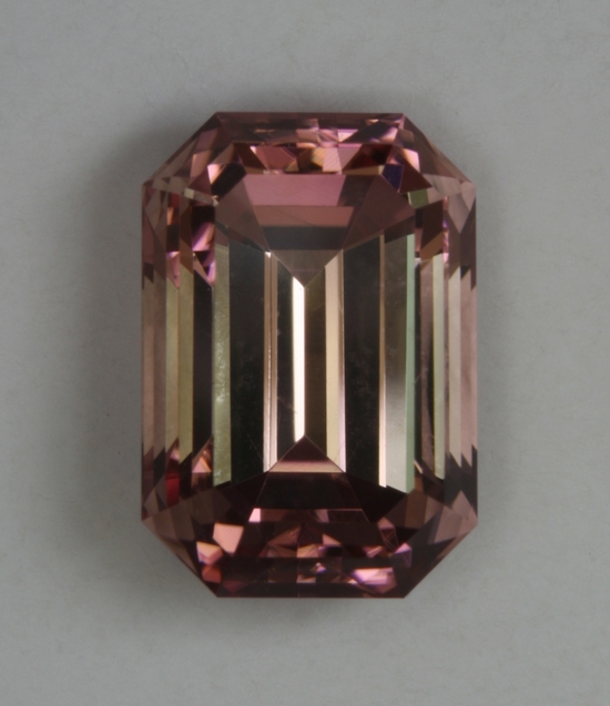 This emerald cut appears to be eye clean and has fine crystal. It is dichroic and has darker ends. Its peach with a pink shadow color is medium toned. It weighs 2.40 carats.