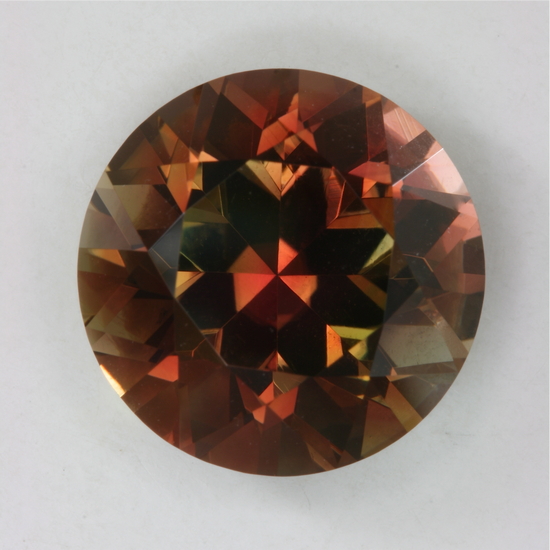 This is both an interesting and beautiful gemstone.  The standard round brilliant is a great cut to mix up colors and this gemstone has great ones to mix.  Both the pink culet and green crown rather disappear when the stone is seen face up.  As you twist the round you see a leading edge of yellow and a body of very good orange followed by a little residual green.  When the stone is at rest you can look threw the table and see the green area in the crown and the pink area in the culet.  Not only is this neat, but I think is is beautiful too and a pure tourmaline play.  The eye clean round is big enough at 7.37 carats to really let you see the action.  The stones medium tone level lets both the primary colors and the mixed colors shine.