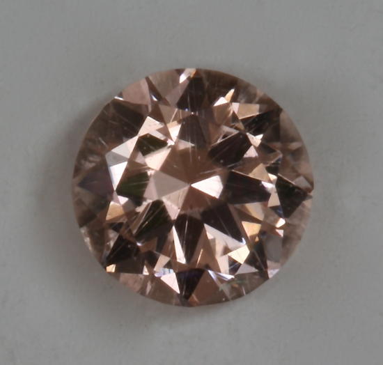 This small standard round brilliant was cut while I was experimenting in cutting small rounds.  I put it in the collection to keep it safe.  It is a nice peach pink of light tone and bright disposition.  It weighs .24 carats and is a color dot.