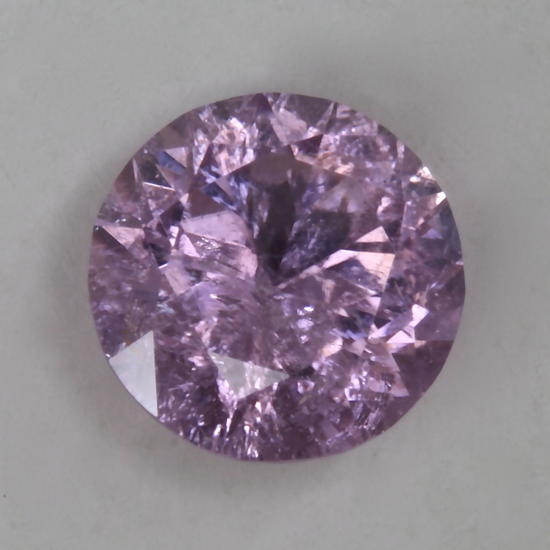 Pink with a touch of violet, included, droplet of color. This standard round brilliant is small and included, but has a touch of violet in its pink from copper. It is a useful member of the droplets of color and weighs .41 carats.