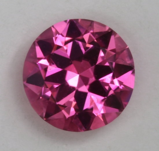 This hot pink standard round brilliant is blessed with an eye clean body.  It is not ashamed to be forward with its bright medium toned flash.  I can really never get enough of this color, but I dream more about purple and yellow.  This probably comes from seeing lots of tourmaline and the demands of my quest for every nuance of color in tourmaline.  This droplet of color weighs .72 carats.