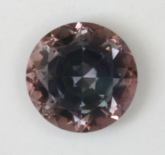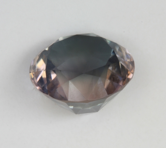 This is a unique tourmaline in the collection. It has a grayish blue table, that's color goes half way toward the girdle, which is peach. It has a deep pavilion of split horizontal mains. It weighs 1.87 carats.