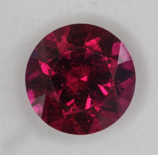 This is one of the anchors upon which the good ship tourmaline, manned by the droplets of color, stays on course.  Except for a few rare cases involving zoned crystals, the reds always have a darker tone value.  And sometimes they can seem to lack as much transparency as you would expect.   Some other reds will disappoint the searcher with a strong purple overtone, or a brownish overtone that comes out in incandescent.  Still the searcher must try to navigate all the near reds and unstable reds and anchor in a safe harbor.   This 1.23 carat standard round brilliant is part of that safe red harbor we have all been seeking.  It is included, but its darker tone level keeps the damage to a minimum.  Its crystal is not the best, but the sultry red that flashes out makes the crew of droplets happy, as they toast it.  For this is a necessary color on the good ship tourmaline.  Trade name for this kind of red is Rubellite.
