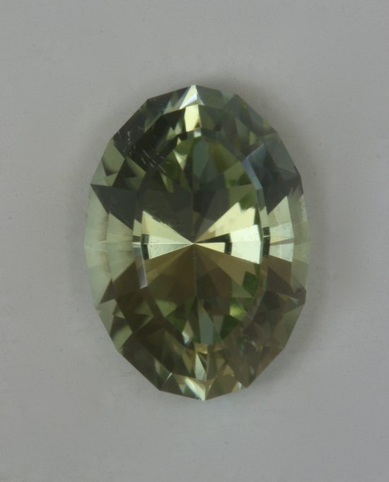 It was a close call, but the official ruling is that this yellow is both free enough of green, to be just a pale yellow and at the same time an IceT pledge. The stone has three rows of step facets on the crown and they make the pastel yellow sing. No inclusions or poor crystal stops this fine gemstone from reaching for the stars. It weighs 2.00 carats.