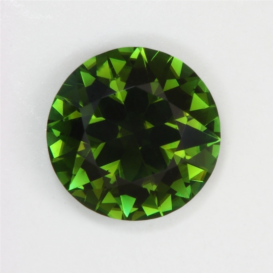 This standard round brilliant has some transparency problems with the c axis under the table. The droplet of color does flash it saturated green around the girdle, only a little in the center. It weighs 1.46 carats.